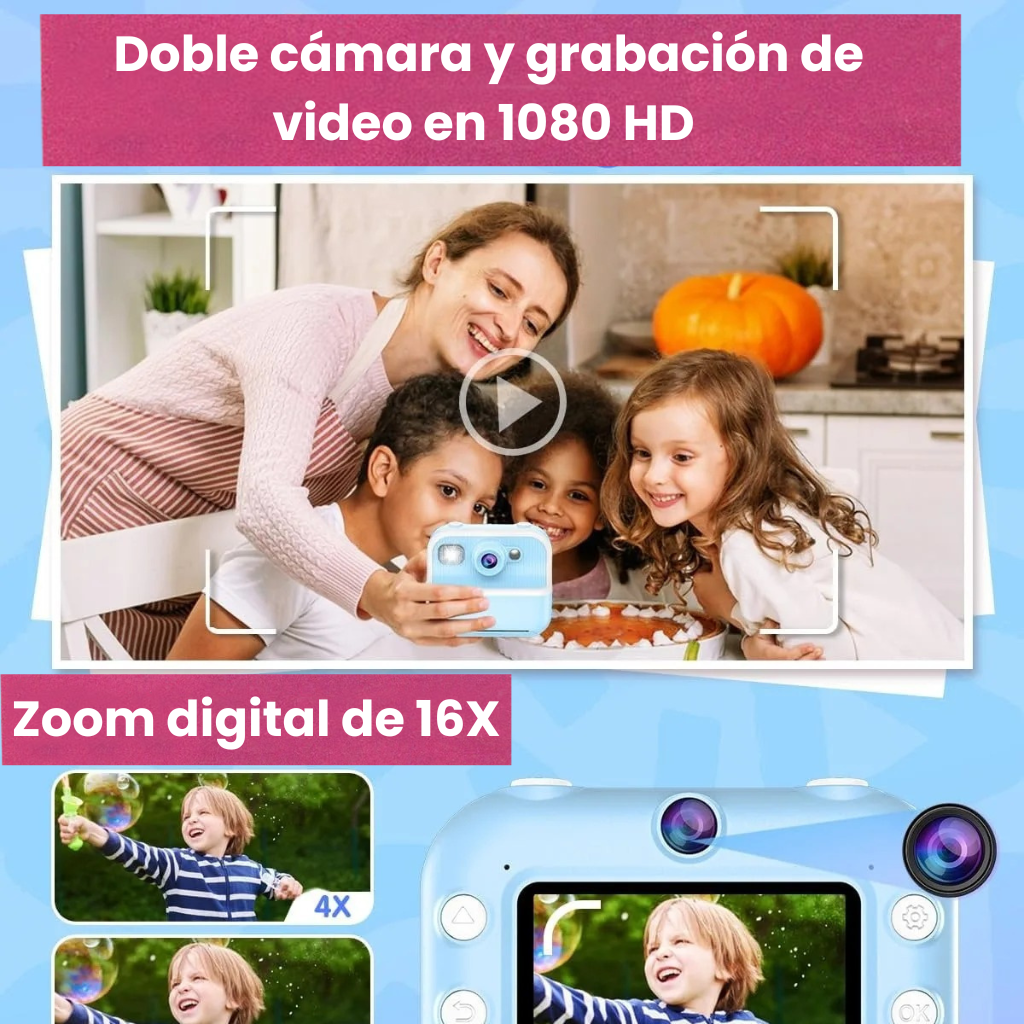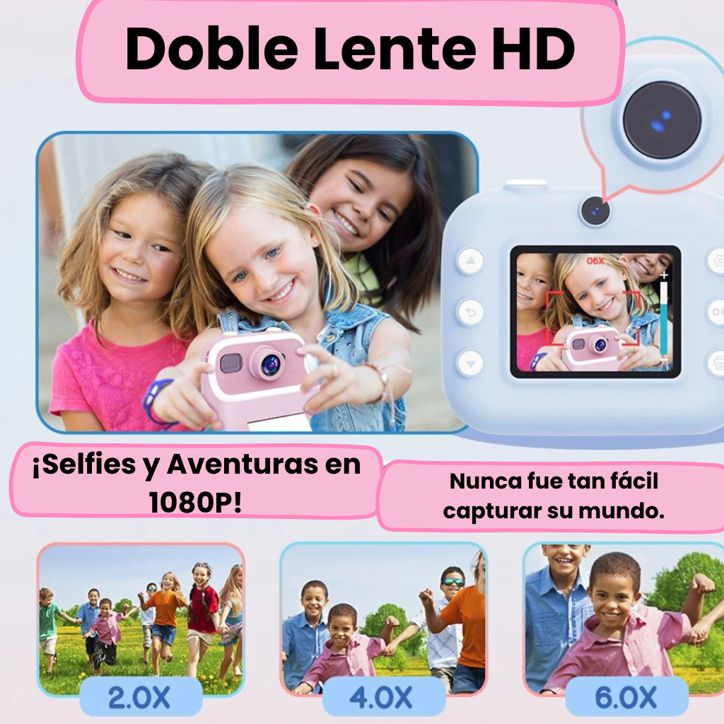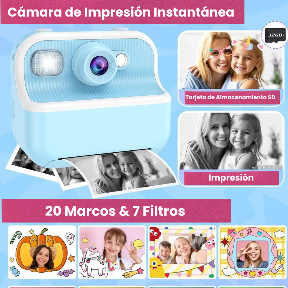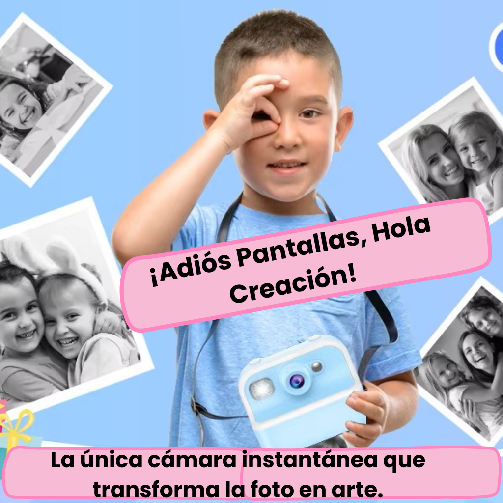 La única cámara instantánea para niños que combina la tecnología de impresión inmediata con la posibilidad de colorear y personalizar las fotos, transformando cada recuerdo en una obra de arte manual.